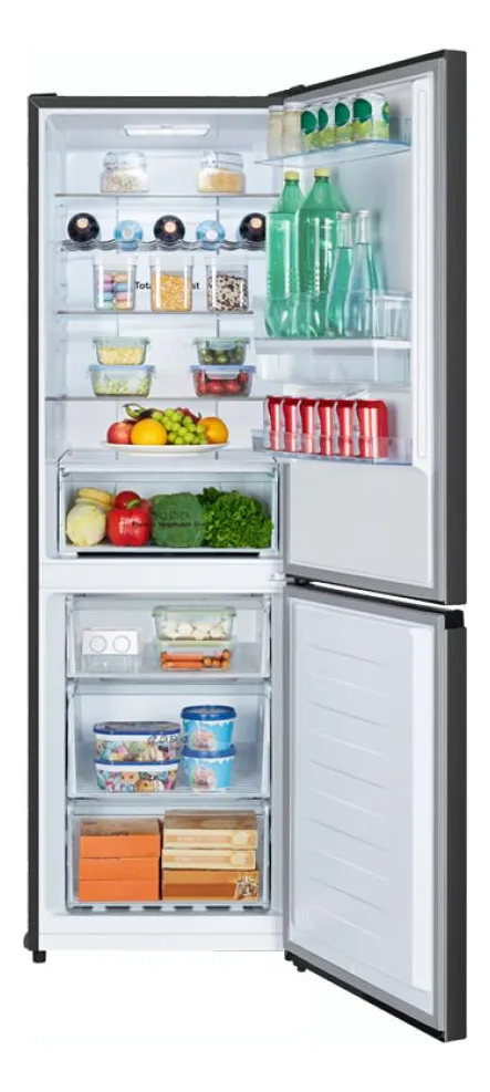 Cuenta con una capacidad total de 304 litros, distribuidos en 207 L para la heladera y 97 L para el freezer ubicado en la parte inferior, lo que permite un acceso cómodo a los alimentos de uso frecuente. Incluye dispensador de agua de carga manual, luz interior LED y un preciso control de temperatura electrónico.