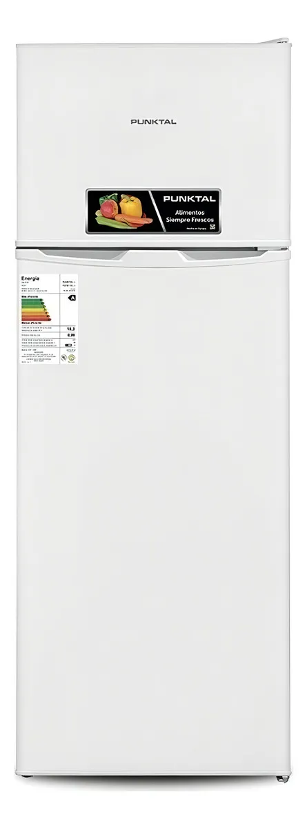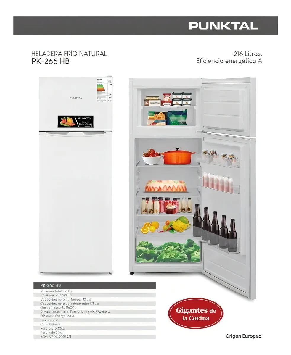La Heladera Punktal PK 265 HB es una opción práctica y eficiente para quienes buscan un equipo compacto con buen espacio interior. Su capacidad total de 216 litros se distribuye en 171 litros para la refrigeración y 42 litros para el freezer, ubicado en la parte superior.