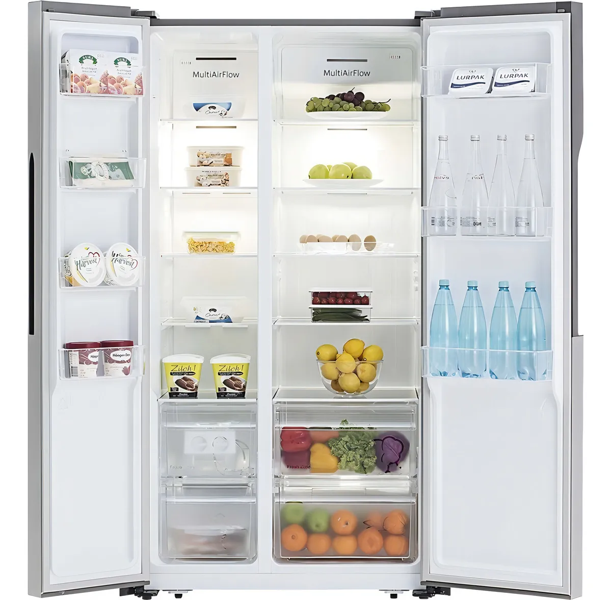 Incorpora dispensador de agua, panel de control digital y alarma de puerta abierta. Su sistema de Multi Air Flow asegura una distribución homogénea del aire frío en cada compartimento. También incluye fábrica de hielo interna y múltiples niveles de almacenamiento tanto en la heladera como en el freezer.