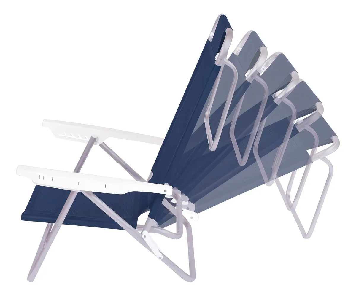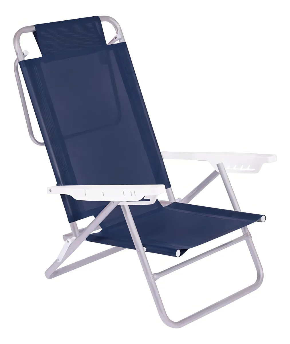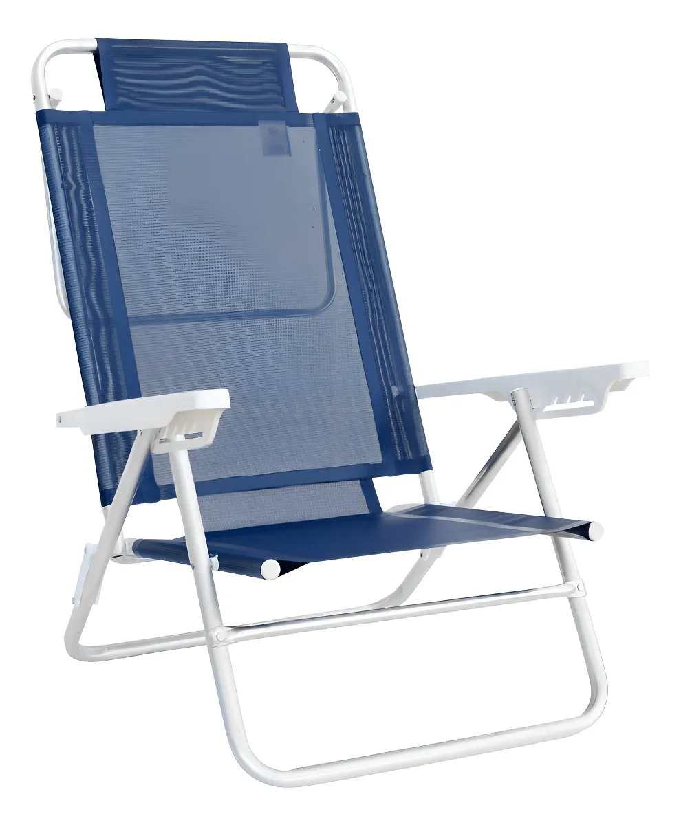 Cuenta con 6 posiciones de reclinado, permitiendo ajustar el respaldo según tu nivel de descanso. Incluye apoyabrazos plásticos, respaldo alto y una base trasera que sirve como apoyo cuando se utiliza en posición casi horizontal. Su diseño plegable facilita el transporte y almacenamiento, ocupando poco espacio.
